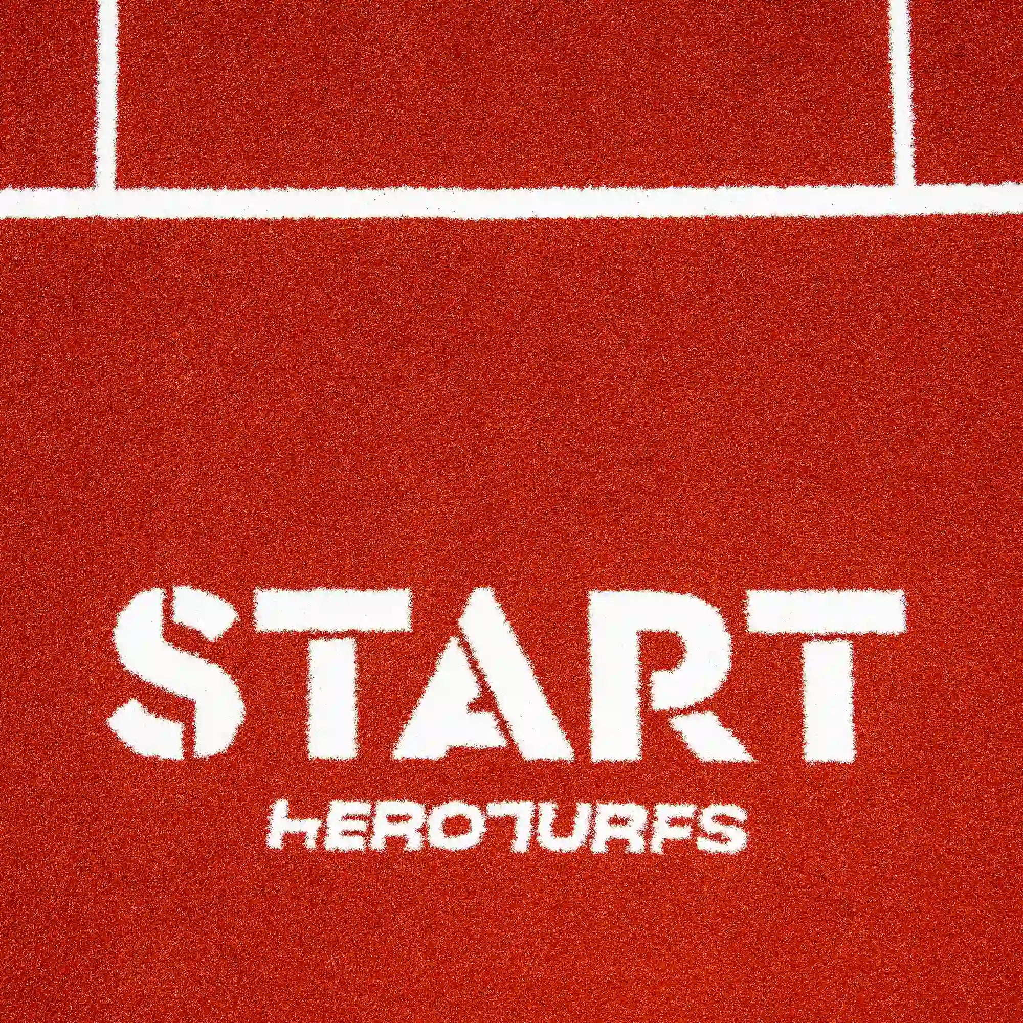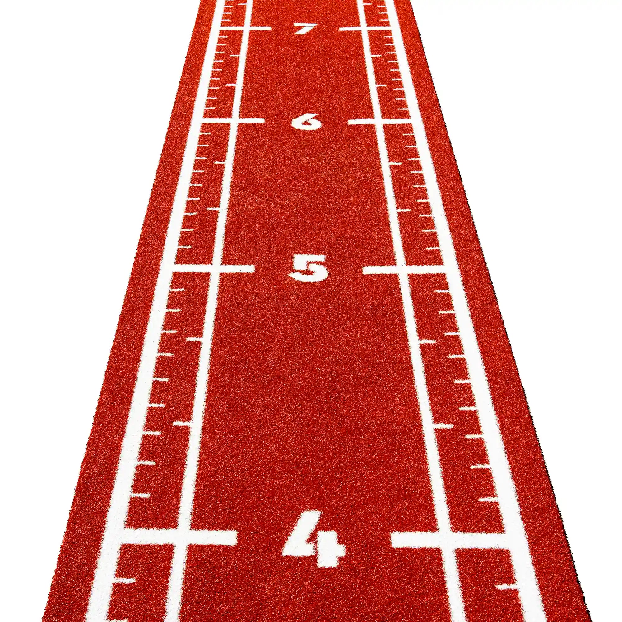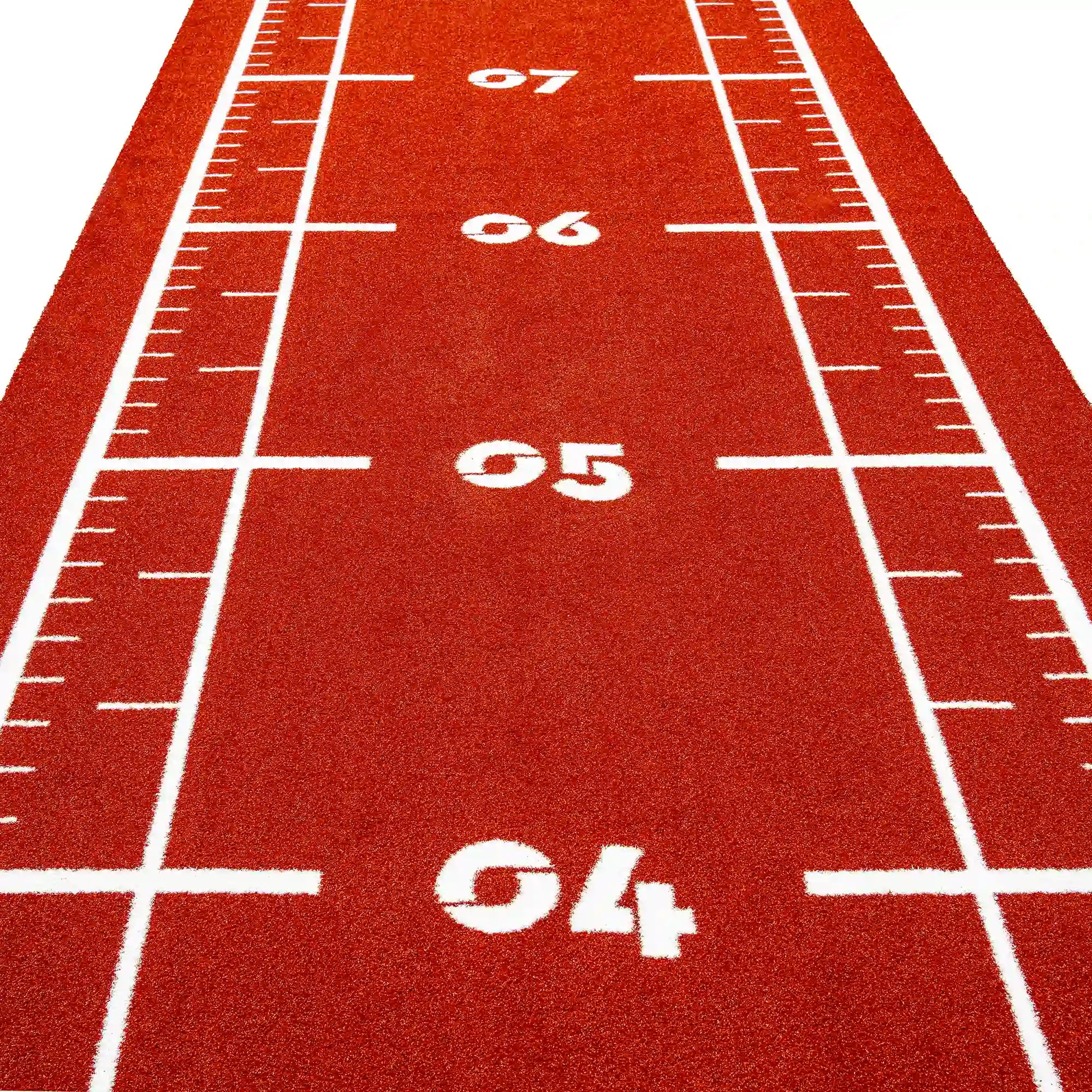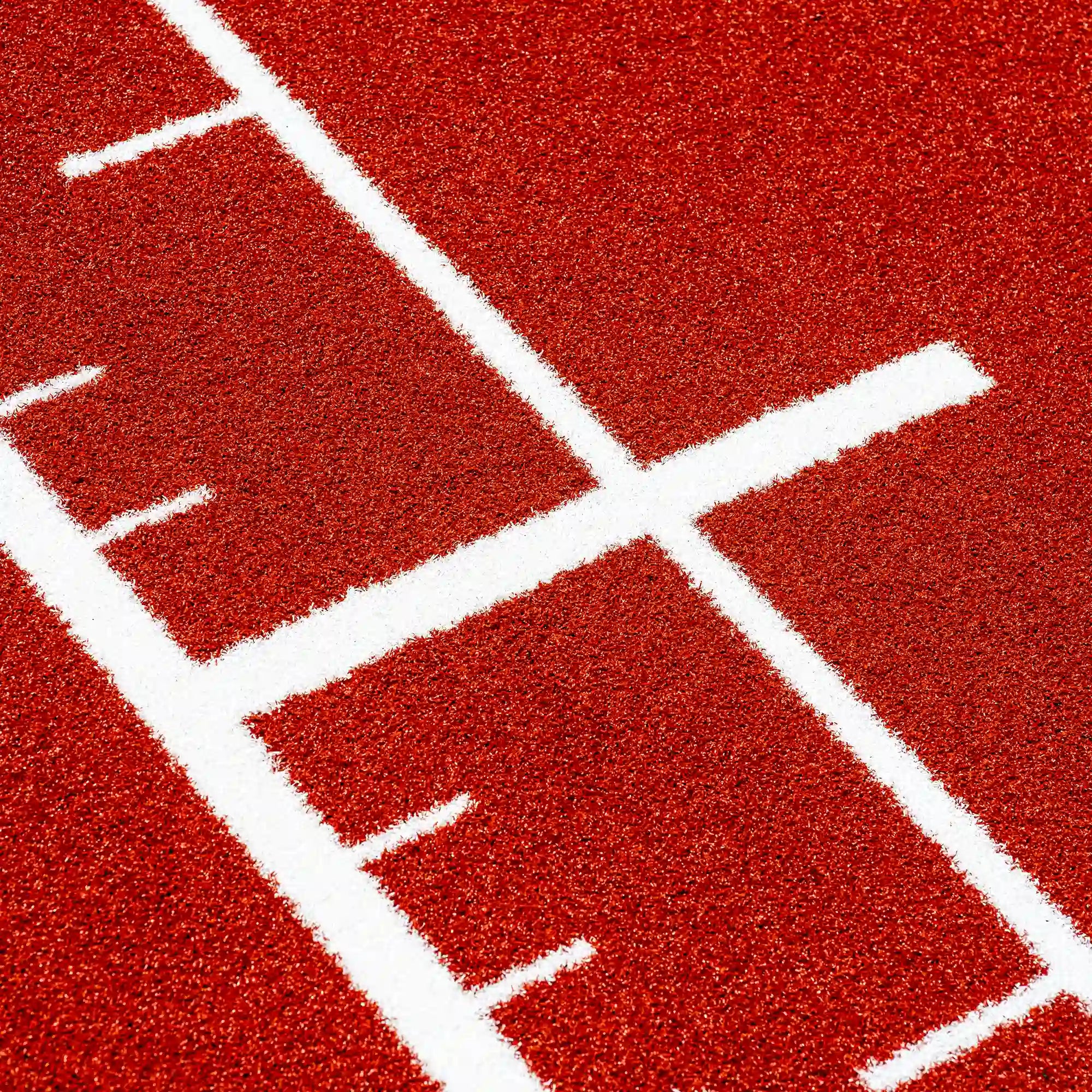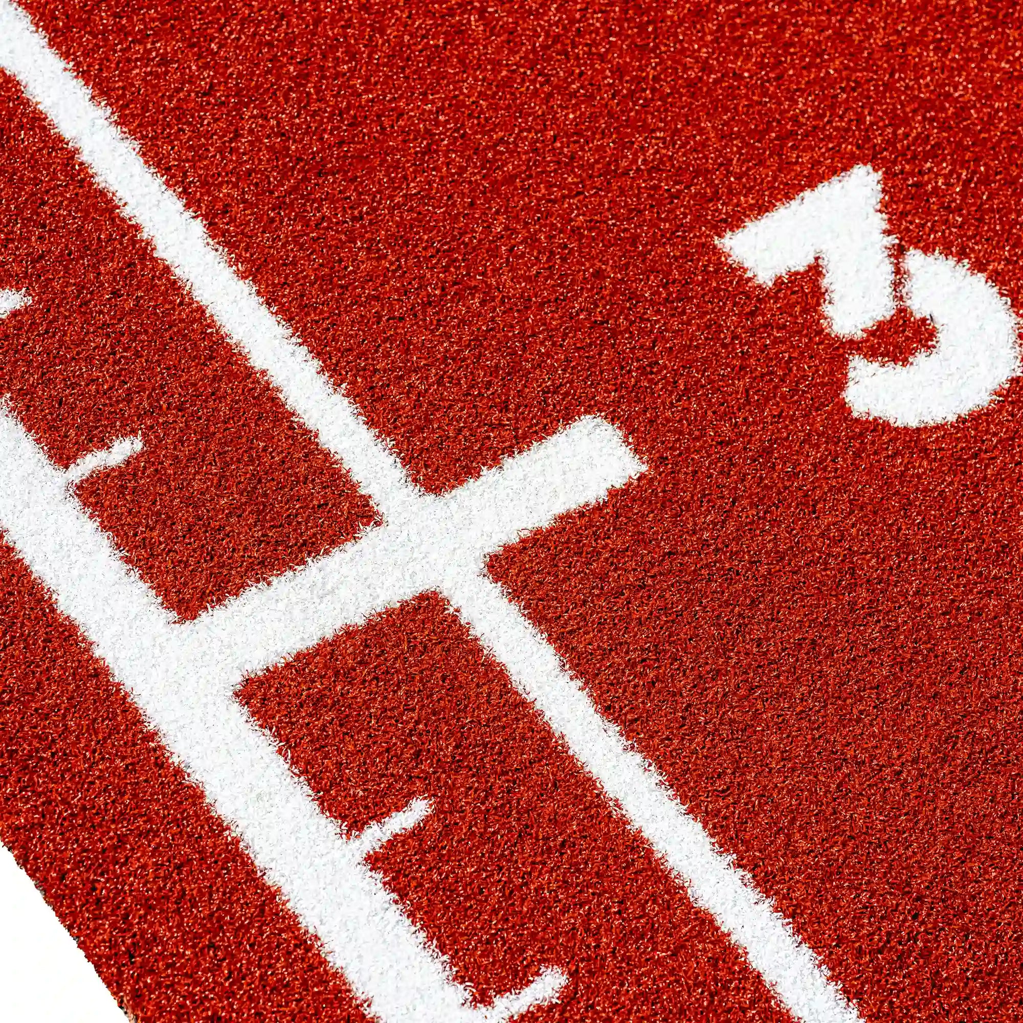 High-performance artificial turf track in bold reddish tones, with integrated white lines and numbers for precise and intense functional training.